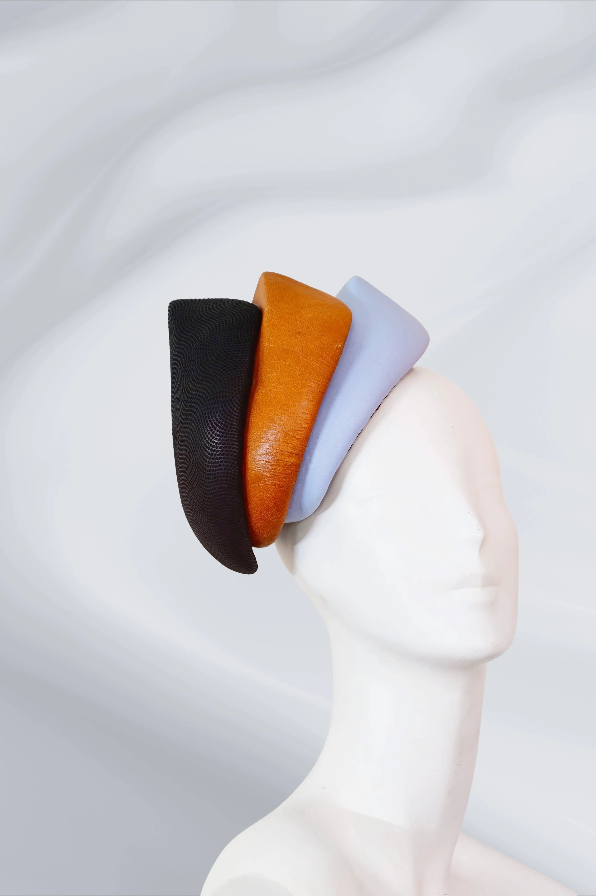 Balance Form is an abstract leather headpiece composed of three sculpted peaks in sky blue, earthy brown, and shadowy black. Each tone suggests an elemental presence—air, earth, and void—brought together in a quiet, harmonious rise. Minimal in contour yet rich in intention, the form echoes the rhythm of natural landscapes shaped by time and stillness. Crafted with precision and restraint, Balance Form blurs the line between adornment and sculpture. It invites the viewer to sense balance not through symmetry, but through flow—where presence and absence, texture and tone, unfold in silent exchange.